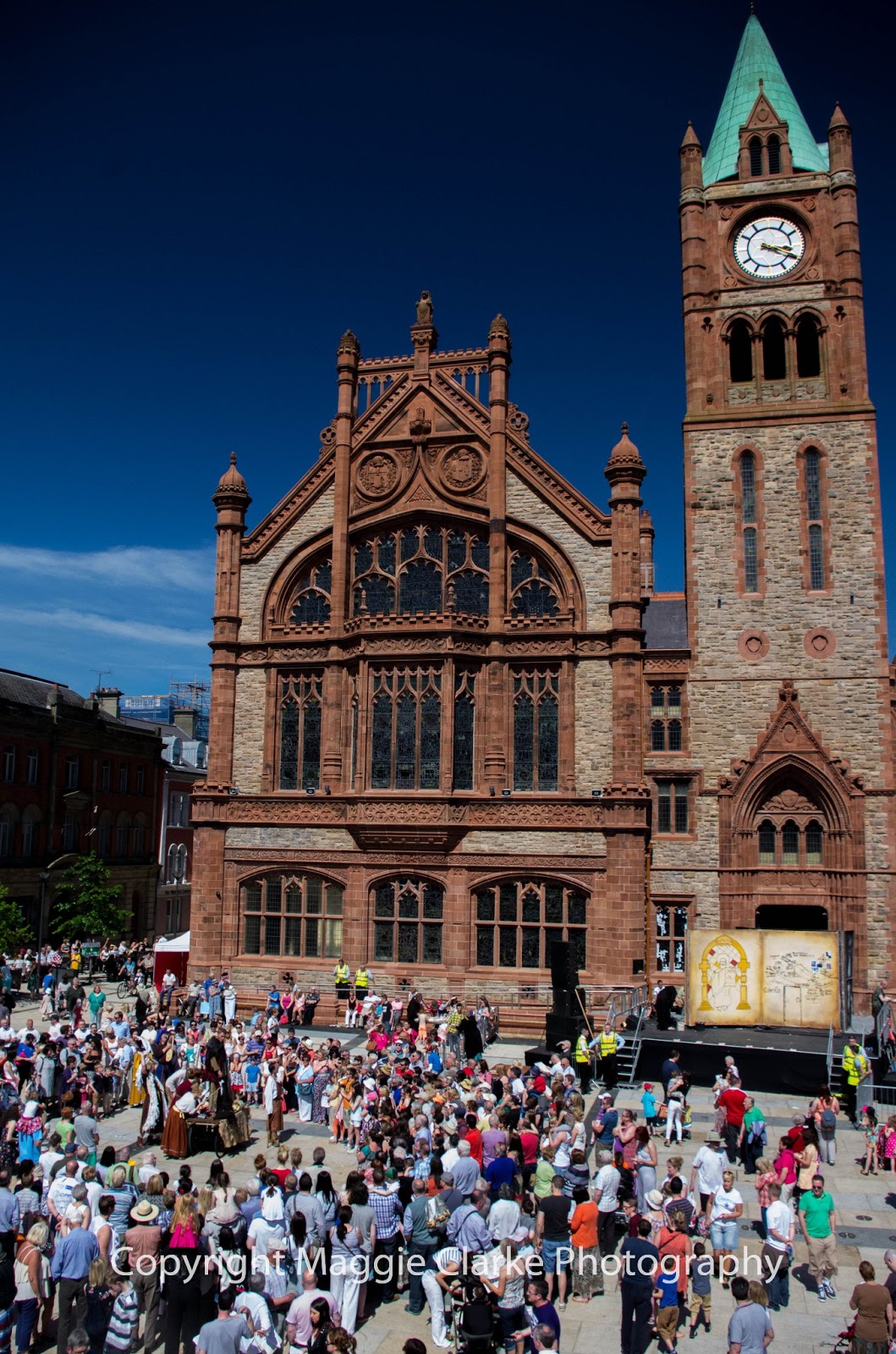 We ended the tour near the Peace Bridge, which was loaded with people, and I had no desire to go on. But I watched from back of the Guild Hall, where I got a San Pelegrino orange, a sandwich, wrapped to go with paper and a string, and brownie, and watched as a couple of guys involved in the celebrations, dressed in full length black robes and hoods, with hoops to hold the robes out in circular fashion, with long parchment in front, message probably in Gaelic, moving about the crowds on concealed Segways! Oh, and also concealed must have been an ipod and battery amp since there was really deep creepy “music” coming out of it as well.